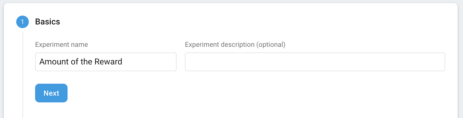 다음 스크린샷과 같이 실험 이름을 '리워드 금액'으로 지정합니다.