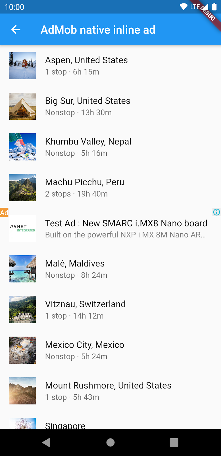 이제 완료됐습니다. 프로젝트를 실행하고 홈페이지에서 Native inline ad(네이티브 인라인 광고) 버튼을 클릭합니다. 광고가 로드되면 목록 중간에 네이티브 광고가 표시됩니다.