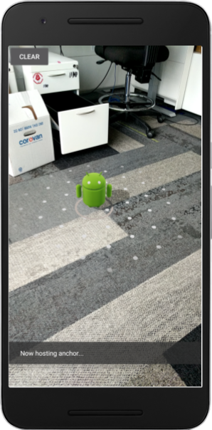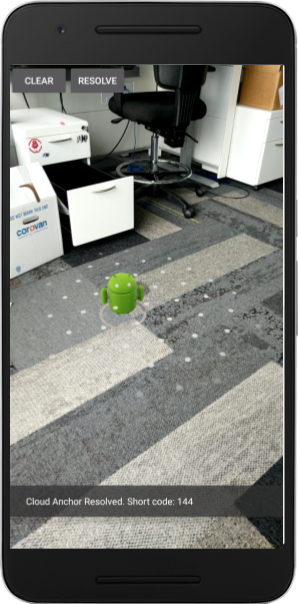 - Cloud Anchor ID を、同じアプリを実行している別のデバイスと共有して、複数のユーザーが同じ位置に Android の像を表示できるようにします。
