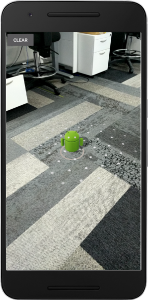 - 平面上のどこかをタップしてアンカーを置きます。アンカーを置いた場所に Android のキャラクターが描画されます。このアプリで一度に置けるアンカーは 1 個だけです。