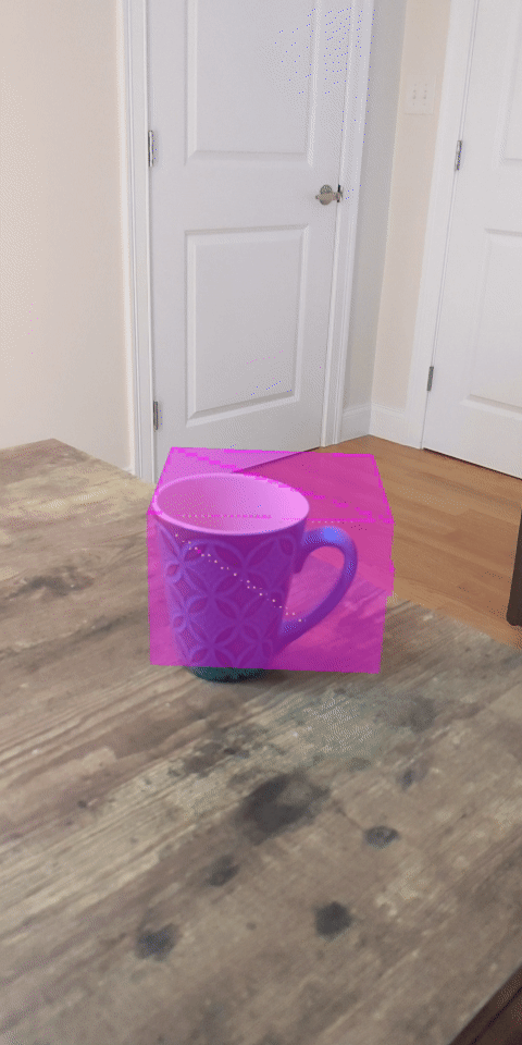 Menjalankan codelab sekarang menghasilkan subset titik yang dirender. Titik-titik ini mewakili objek dalam adegan, sambil mengabaikan permukaan datar tempat objek diletakkan. Anda dapat menggunakan data ini untuk memperkirakan ukuran dan posisi objek dengan mengelompokkan titik-titik pengelompokan.