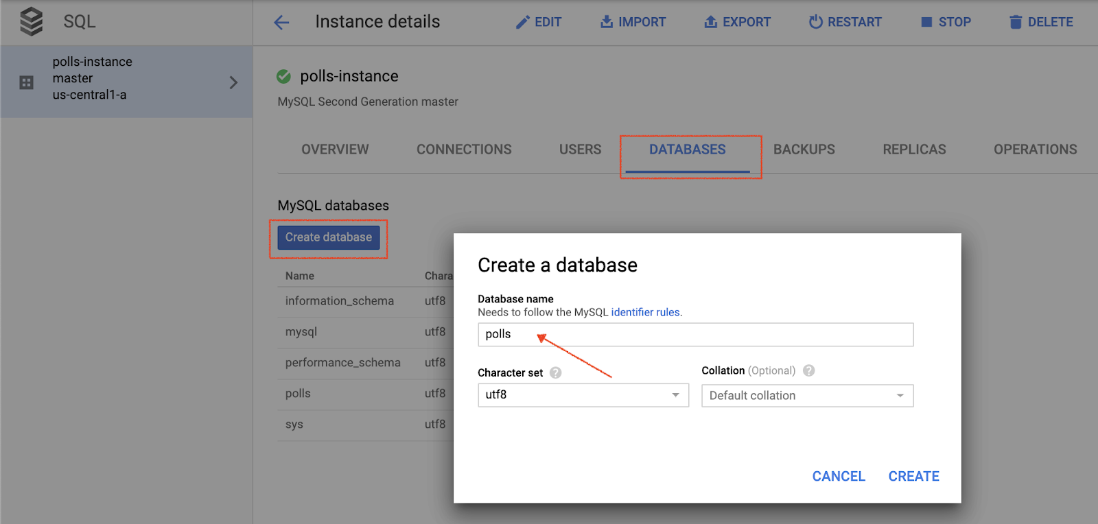 - polls-instance라는 Cloud SQL 인스턴스용 Google Cloud 콘솔을 사용하여 새 데이터베이스를 만듭니다. 예를 들어 'polls'를 입력할 수 있습니다. 을 이름으로 사용하겠습니다.