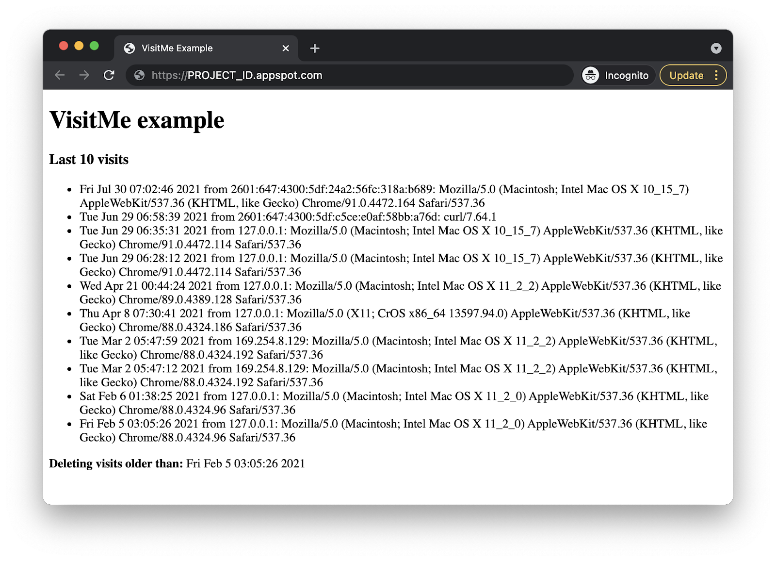 Stellen Sie die Anwendung mit gcloud app deploy bereit. Die Ausgabe sollte mit der App für Modul 1 identisch sein, mit Ausnahme einer neuen Zeile am unteren Rand, in der angezeigt wird, welche Besuche gelöscht werden: