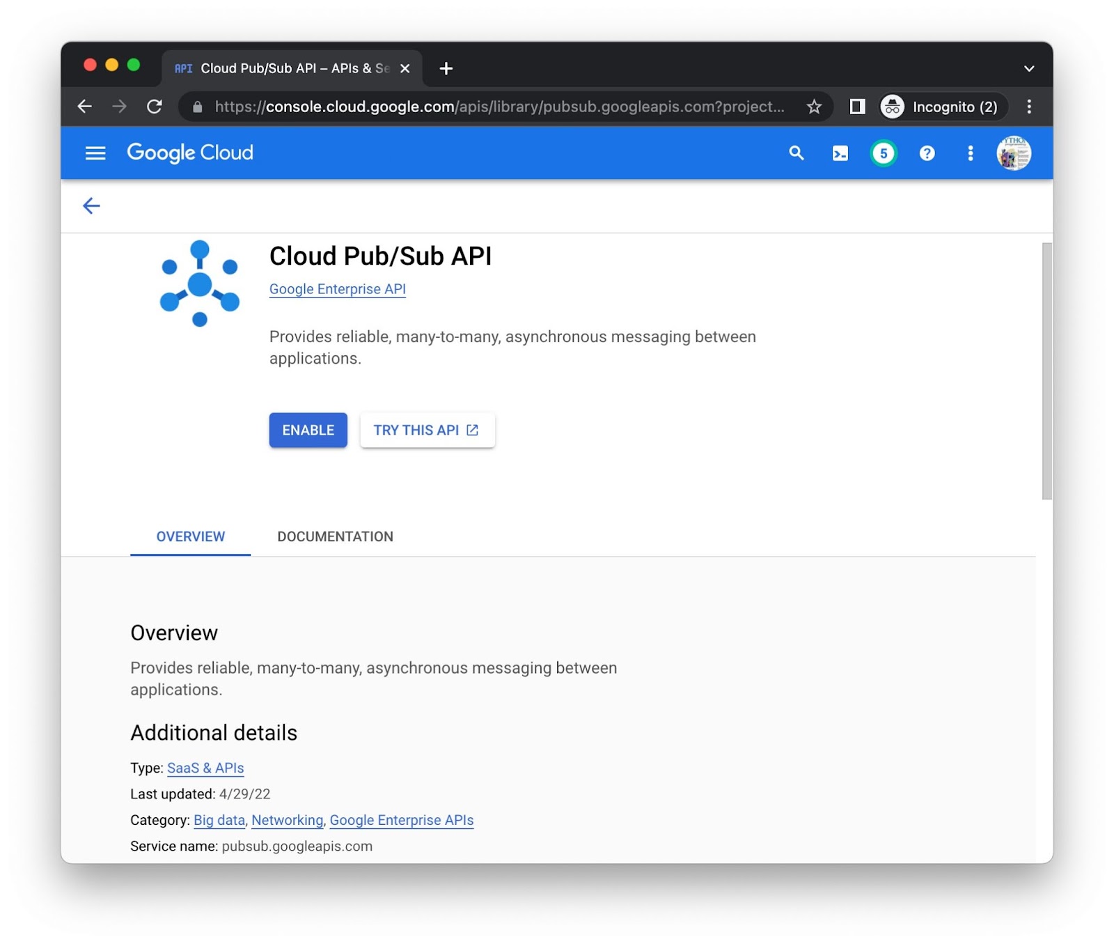 Klicken Sie für jede API einzeln auf die Schaltfläche Aktivieren. Dann werden Sie möglicherweise aufgefordert, Zahlungsinformationen anzugeben. In diesem Beispiel sehen Sie die Seite mit der Cloud Pub/Sub API-Bibliothek. Aktivieren Sie nicht die Pub/Sub API für dieses Codelab, sondern nur Cloud Tasks und Datastore: