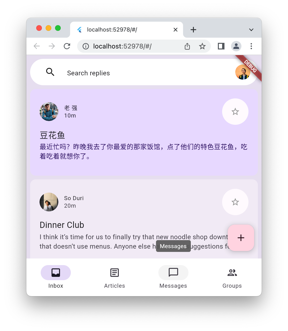 এই কোডল্যাবে, আপনি একটি মক মেসেজিং অ্যাপ্লিকেশন তৈরি করতে যাচ্ছেন। আপনার অ্যাপ হবে: