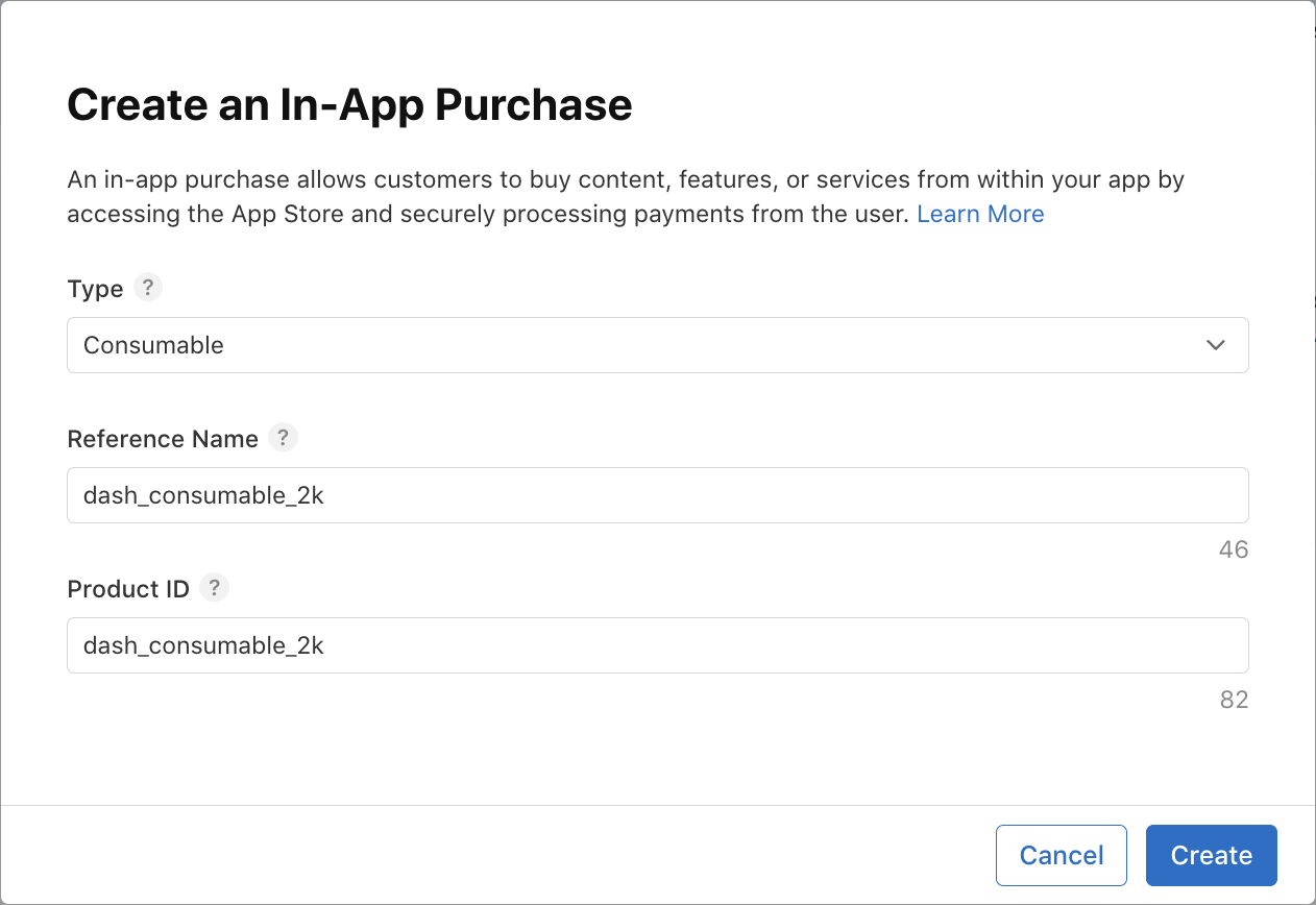 dash_consumable_2k设置为消耗型。使用dash_consumable_2k作为商品 ID。参考名称仅在 App Store Connect 中使用,只需将其设置为dash consumable 2k即可。