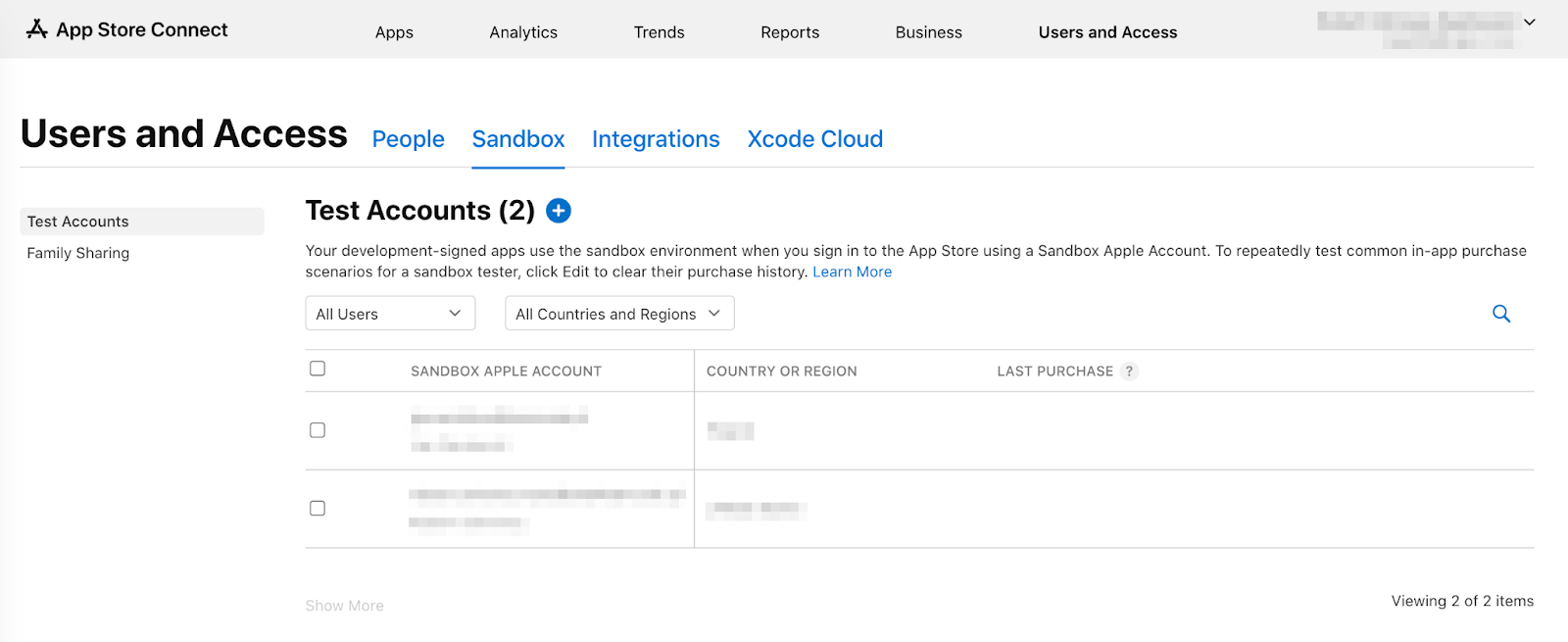 如需测试应用内购,您需要沙盒测试用户。此测试用户不应与 iTunes 关联,仅用于测试应用内购。您无法使用已用于 Apple 账号的电子邮件地址。在用户和访问权限中,前往沙盒以创建新的沙盒账号或管理现有的沙盒 Apple ID。