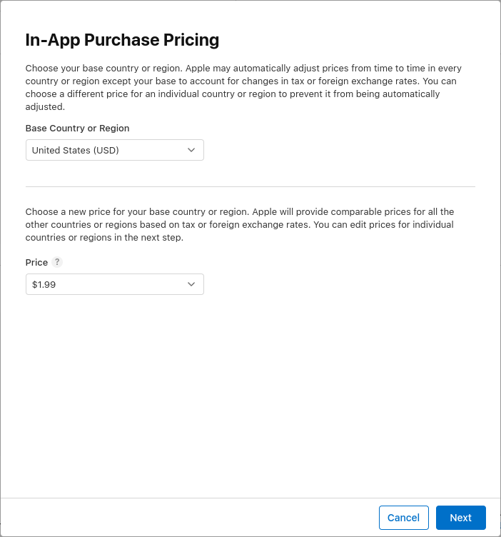 添加价格并将价格设置为 $1.99或其他币种的等值价格。