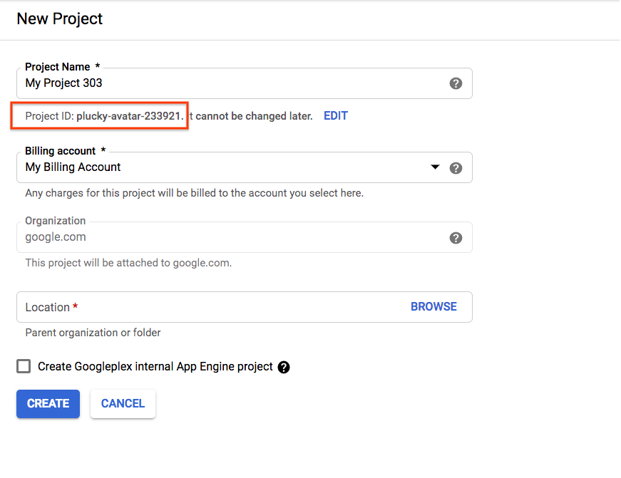 Si vas a crear un proyecto nuevo, el ID del proyecto se encuentra justo debajo del nombre del proyecto en la página de creación. |