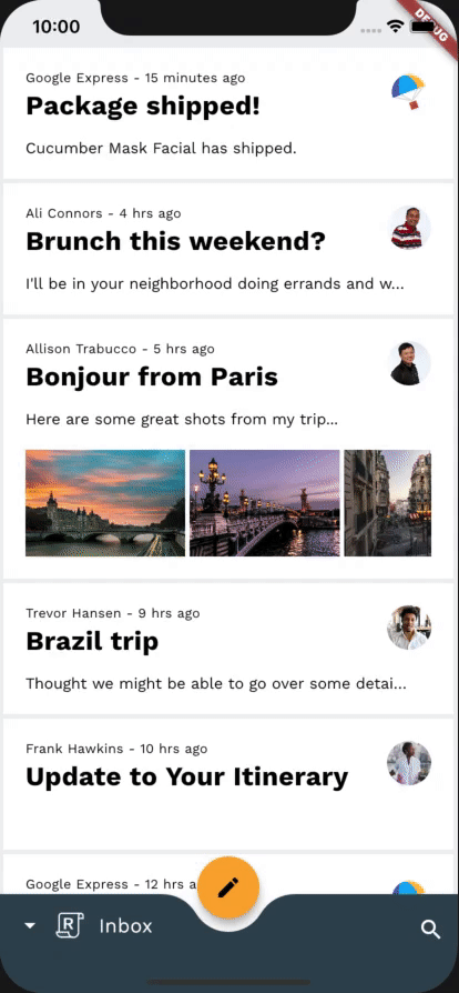 إعادة تشغيل التطبيق عند فتح درج التنقل السفلي وتغيير صناديق البريد، من المفترض أن تتلاشى القائمة الحالية للرسائل الإلكترونية وتتسع بينما تتلاشى القائمة الجديدة وتصبح كبيرة. أحسنت.
