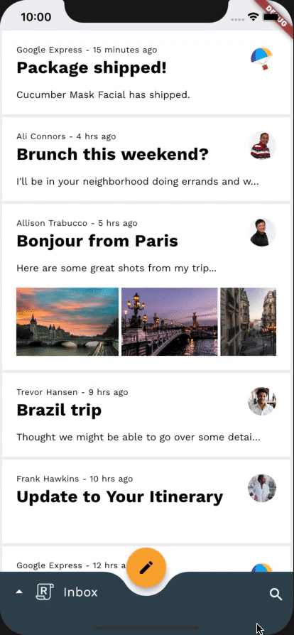 เรียกใช้แอปอีกครั้ง เมื่อเปิดลิ้นชักการนำทางด้านล่างและเปลี่ยนกล่องจดหมาย รายการอีเมลปัจจุบันจะค่อยๆ ปรากฏขึ้นและค่อยๆ ปรากฏขึ้น ในขณะที่รายการใหม่จะค่อยๆ ปรากฏขึ้นและค่อยๆ ปรากฏขึ้น เยี่ยมไปเลย