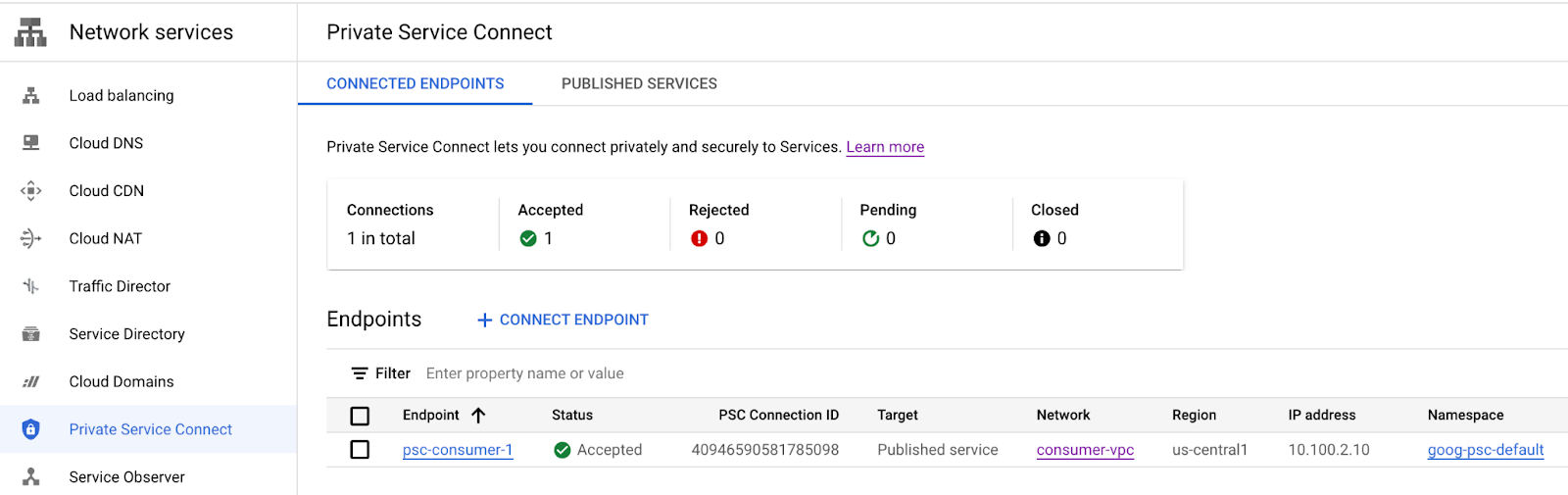 Desde la VPC del consumidor, navega a Servicios de red → Private Service Connect→ Extremos conectados para verificar que haya una conexión de servicio privada exitosa. Observa la conexión psc-consumer-1 establecida y la dirección IP correspondiente que creamos anteriormente.