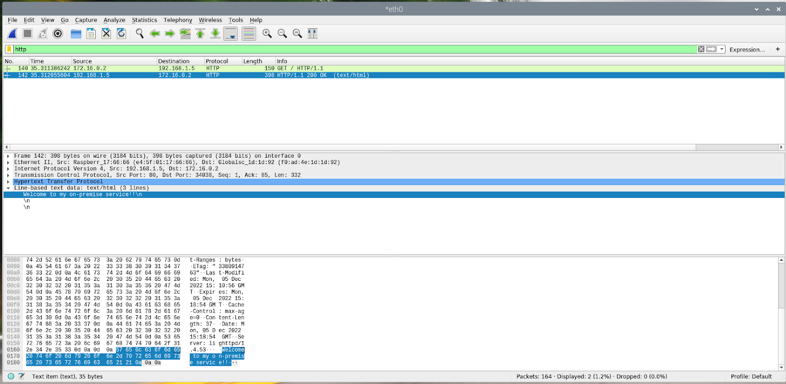 A continuación, se proporciona una captura de ejemplo del servicio local. Ten en cuenta que la dirección IP de origen 172.16.0.2 es del rango de subred de proxy TCP 172.16.0.0/23.