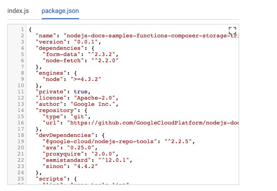 按一下「package.json」分頁標籤,複製這組程式碼並貼到 Cloud Functions 內嵌編輯器中的 package.json 部分 |