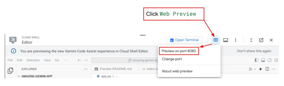 لا تنسَ استبدال [PROJECT_ID] برقم تعريف مشروعك. تأكَّد من أنّ دليل العمل الحالي في وحدة الطرفية هو **amazing-gemini-app**، ثم أدخِل الأوامر التالية بهذا الترتيب واحدًا تلو الآخر: