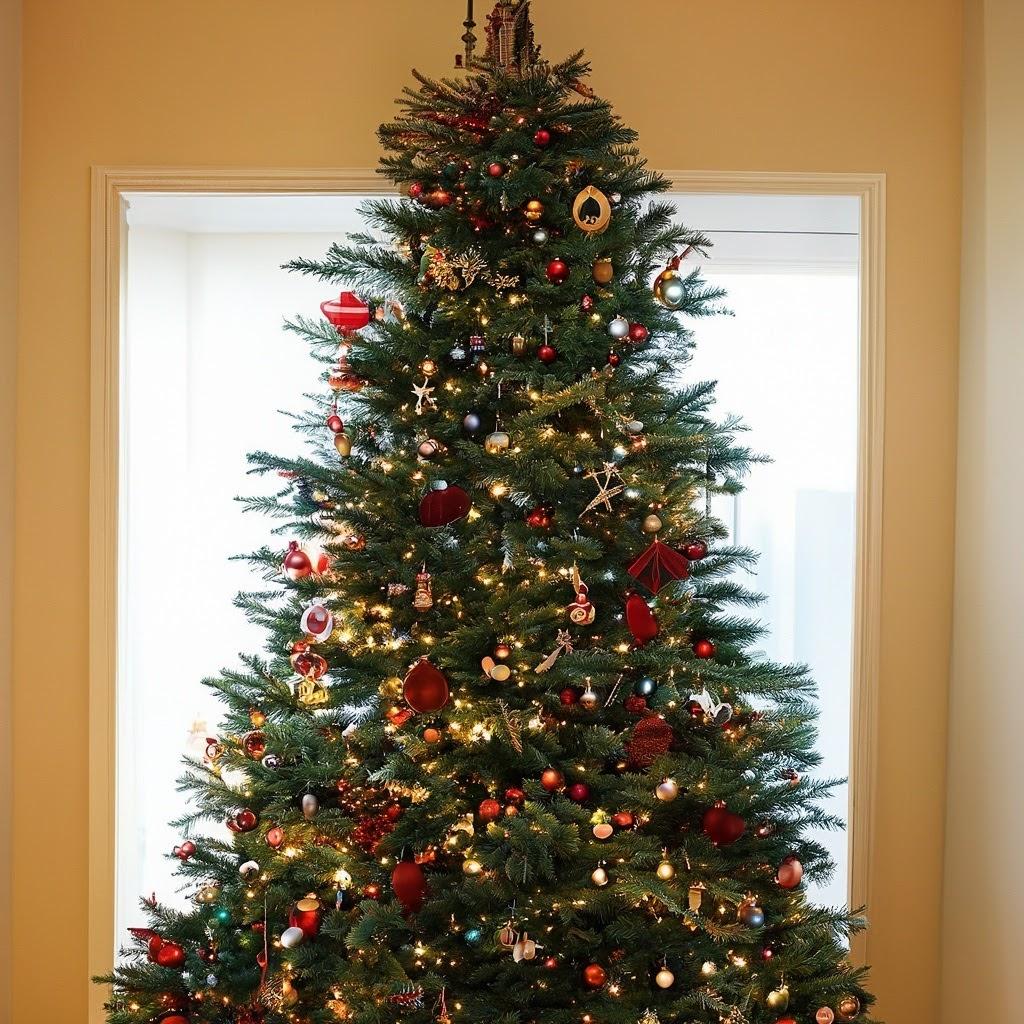 [Right image] Consigna (con instrucciones generadas por Text-Bison) : Un árbol de Navidad en una habitación con una lámpara y muebles. El árbol está decorado con luces y adornos. Se coloca cerca de una ventana y hay una pared visible en el fondo. Iluminación cálida, alta calidad, foto HDR tomada desde lejos por un Fotógrafo profesional.