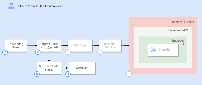 شما یک گروه نقطه پایانی شبکه بدون سرور ( NEG بدون سرور ) برای سرویس UI کارمند Cloud Run ایجاد خواهید کرد. NEG های بدون سرور به شما امکان می دهند از برنامه های بدون سرور Google Cloud با تعادل بار HTTP(S) خارجی استفاده کنید.