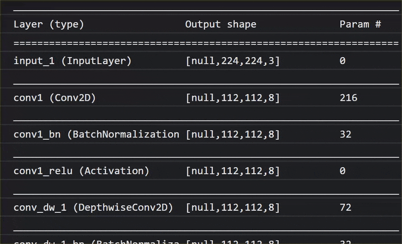 이 애니메이션에서는 이 MobileNet V1 모델에 포함된 수많은 레이어를 볼 수 있습니다.